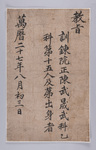 1599년(선조 32) 8월 3일에 진무성이 무과 을과 15인으로 급제하며 발급받은 홍패 -